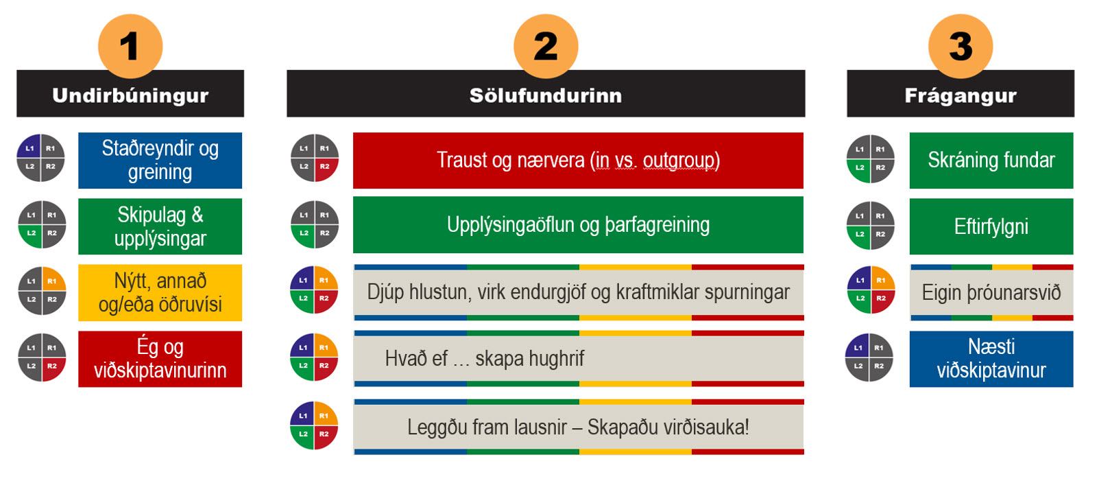 Af hverju bregðumst við við með mismunandi hætti. Af hverju á Gulur erfitt með að sannfæra Grænan? Af hverju nær Blár ekki sambandi við Rauðan? Af hverju eiga Grænir svona erfitt með að hugsa út fyrir kassann? Árangursrík viðskiptatengsl byggja fyrst og fremst á færni sölumannsins í að greina viðskiptavininn og þær aðstæður sem hann finnur sig í.