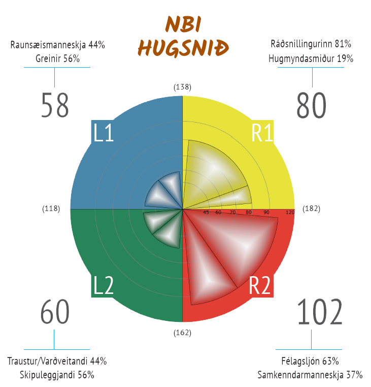 Bls. 1: Forsíða. Bls. 2: Mynd af Hugsniði í fjórðungum. Bls. 3: Hvernig túlkar þú niðurstöðurnar. Bls. 4: Almennar upplýsingar tengdar hverjum fjórðungi hugsniðs. Bls. 5: Upplýsingar afmarkaðar við viðkomandi út frá svörum hans. Bls. 6: Svör spurninga sem liggja til grundvallar hvers fjórðungs. Bls. 7: Átta-vídda niðurstöður og skipting á milli vídda. Bls. 8: Almennar upplýsingar beggja vídda í hverjum fjórðungi hugsniðs.